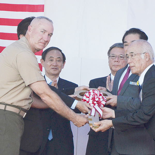 負担軽減を象徴するイベントとして西普天間住宅地返還式典が4日、宜野湾市の米軍キャンプ瑞慶覧(ずけらん)で行われた。沖縄担当相でもある菅官房長官が急遽(きゅうきょ)出席することになったのは、政府の基地負担軽減に対する強い決意の表れだ。