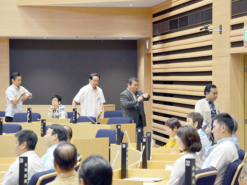 那覇市4月議会臨時議会が4月27日から6日間の日程で行われ、最終日8日の採決では賛成24、反対2で可決された。賛成したのは共産、社会、新風会など翁長雄志(おながたけし)知事と城間幹子市長を支持する勢力。一方、自民は「安全性が確保されておらず、採決以前の問題。市長が提案する議案として、受け入れられない」と採決を前に退場。公明も予算案に納得できず退場した。