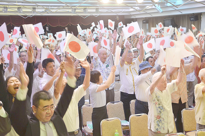 このほか、佐喜真淳宜野湾市長、復帰後に生まれた青年世代を代表して我那覇真子氏(琉球新報と沖縄タイムスを正す県民・国民の会代表)、教員として復帰運動に携わった元中学校教員の上原義雄氏が登壇。上原氏は、昨年の沖縄の観光客数が過去最高の700万人を記録したのは「沖縄が安全だから。そして、安全なのは米軍基地があるからだ」と訴えた。