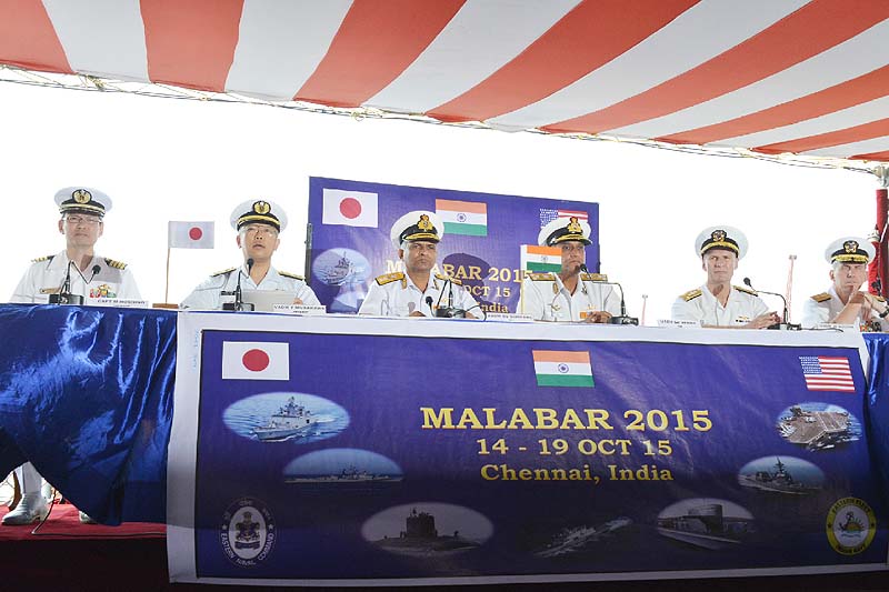 日米印海軍幹部は演習前の15日、インド南部チェンナイで会見。 米海軍第7艦隊のオーコイン司令官は「協調的な安全保障環境をつくるために自衛隊の定期的な参加を期待する」と述べ、海上自衛隊の役割に期待を示した。これに対し、海上自衛隊の村川豊海上幕僚副長は「相互運用性を高め、政府が掲げる積極的平和主義のもと3カ国の連携を深めたい」と述べた。また印海軍のベルマ中将は「3カ国はインド洋から太平洋にかけて平和と安定を確保する役割を担っている」と述べ、3カ国海軍協調の意義を強調した。