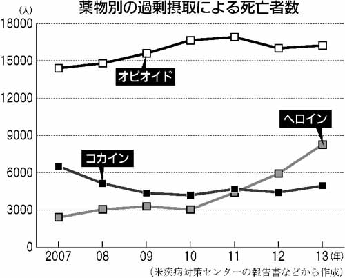 CDCの報告では、14年の薬物過剰摂取による死亡者数は4万7055人で、13年の4万3982人から約6・5%増加した。そのうち、オピオイドと呼ばれる麻薬性鎮痛薬とヘロインの合計死亡者数が全体の約6割に達しているなど、特に深刻化している。